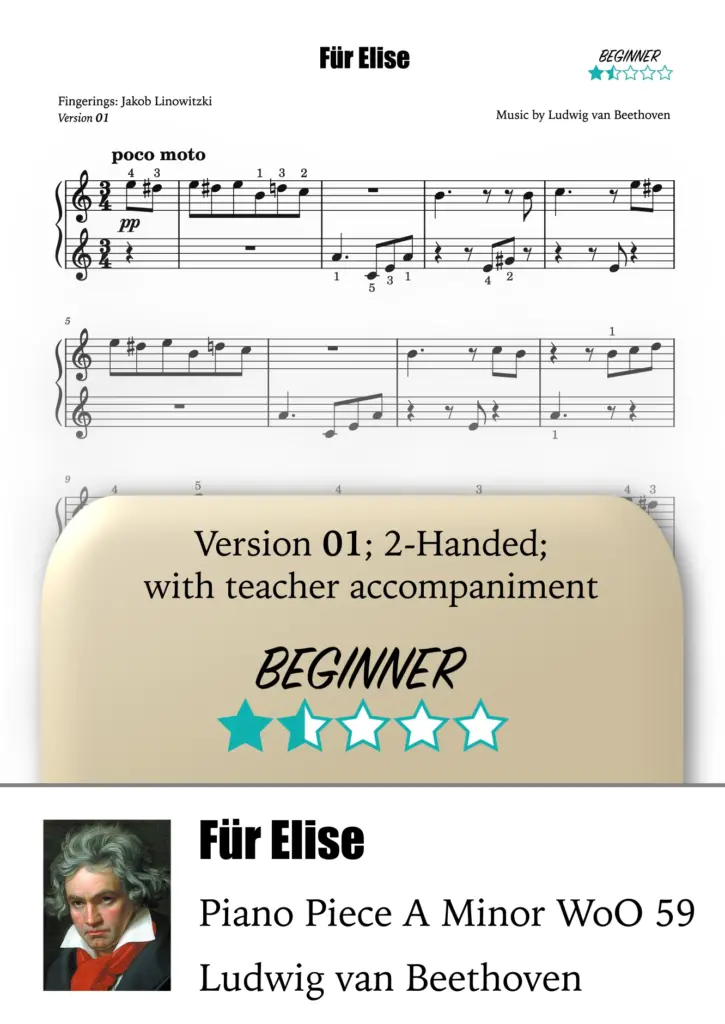 The piano piece Für Elise in A minor, WoO 59, was composed by Ludwig van Beethoven around 1810 and has become one of the most beloved classical works worldwide over the past decades. The first section of this rondo-like piece is particularly famous, while the lesser-known middle sections are more challenging than the main theme.