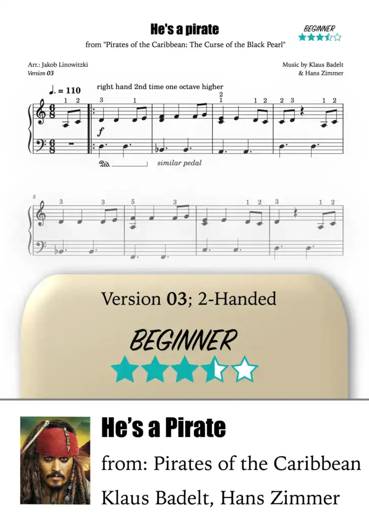 The piece He’s a Pirate is from the soundtrack of the film Pirates of the Caribbean: The Curse of the Black Pearl (2003) and was composed by Klaus Badelt, with additional music by Hans Zimmer. The energetic melody with its distinctive rhythm has become a hallmark of the entire film series.