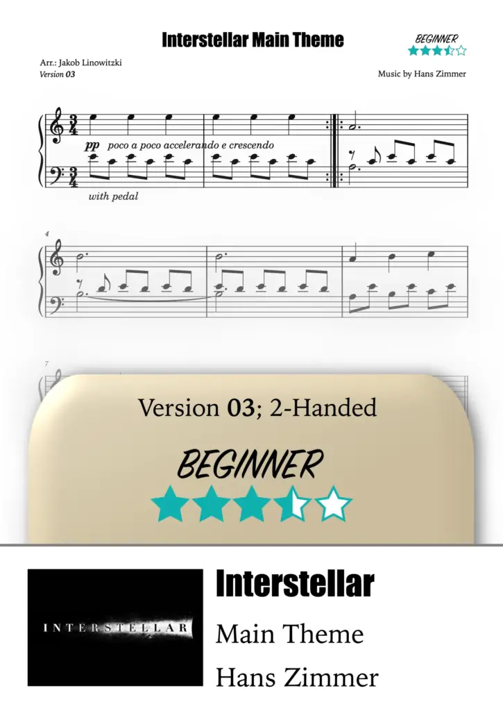 The Main Theme from the film Interstellar (2014) was composed by Hans Zimmer and is one of his most famous film scores. The music is known for its meditative character, the powerful organ sound, and the gradually building dynamics that perfectly capture the themes of time, space, and infinity.