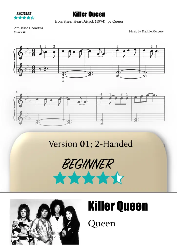 The song Killer Queen was written by Freddie Mercury and released by the British rock band Queen in 1974 on the album Sheer Heart Attack. It was also issued as a single and became the band’s first major international hit, reaching No. 2 on the UK Singles Chart and entering the US Top 20. The lyrics describe a high-class call girl, told through witty and ironic imagery. Musically, the song blends glam rock with elements of music hall and features multi-tracked vocals and a distinctive piano line, helping to establish Queen’s signature style.