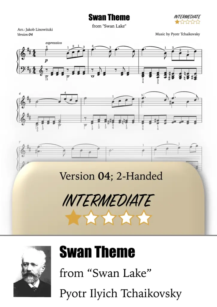 The main theme (Swan Theme) from the ballet Le Lac des cygnes (Swan Lake) was composed in 1875–1876 by Pyotr Tchaikovsky and is one of the most famous melodies in classical music. It appears primarily in the scenes featuring the swan motif and conveys a gentle, melancholic atmosphere, highlighting the central theme of transformation and the longing of Princess Odette.