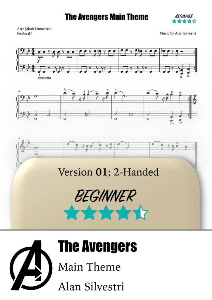 This heroic main theme was composed by Alan Silvestri for the film The Avengers (2012). It begins in G minor and later modulates to E minor, where various brass instruments play the distinctive main motif. Since then, the piece has been used in different variations throughout Marvel films. I have arranged it in six different piano versions.