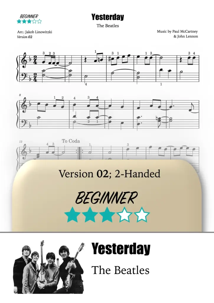 The song Yesterday was written by Paul McCartney and recorded by the Beatles in 1965 for their album Help!. It was released as a single in the United States, where it reached No. 1 on the Billboard Hot 100 for four weeks. The song is performed by McCartney alone, accompanied by a string quartet arranged by producer George Martin. Lyrically, Yesterday expresses a sense of loss and longing, as the singer reflects on a past relationship and wishes he could return to happier times. With more than 1,600 cover versions, it has become one of the most recorded and recognized songs in music history.