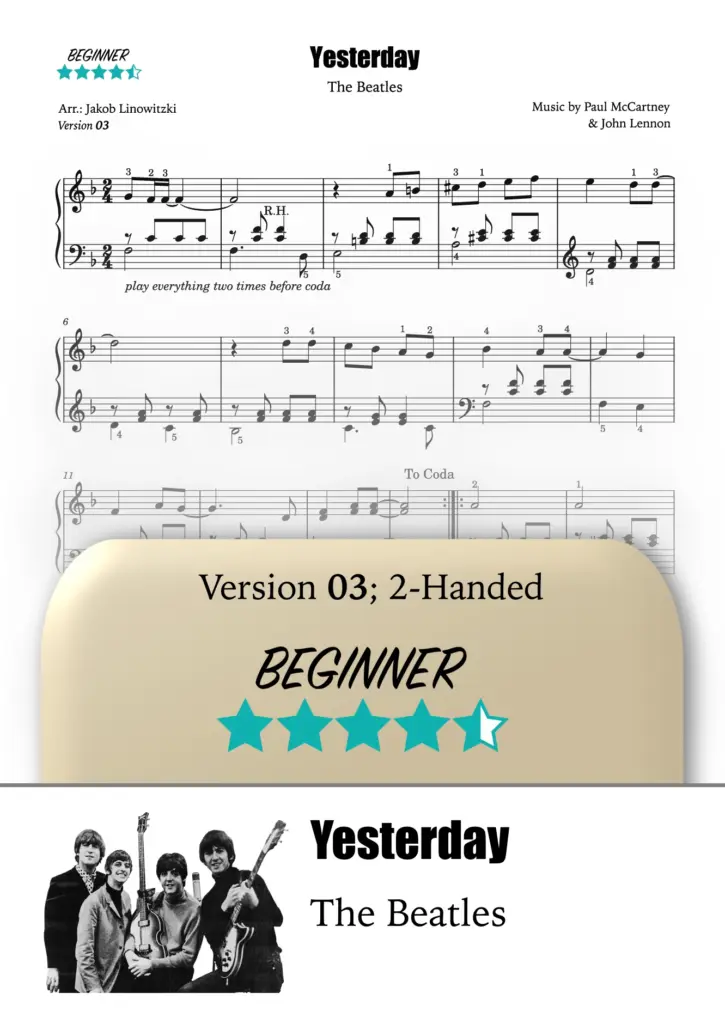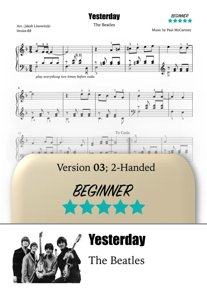 The song Yesterday was written by Paul McCartney and recorded by the Beatles in 1965 for their album Help!. It was released as a single in the United States, where it reached No. 1 on the Billboard Hot 100 for four weeks. The song is performed by McCartney alone, accompanied by a string quartet arranged by producer George Martin. Lyrically, Yesterday expresses a sense of loss and longing, as the singer reflects on a past relationship and wishes he could return to happier times. With more than 1,600 cover versions, it has become one of the most recorded and recognized songs in music history.